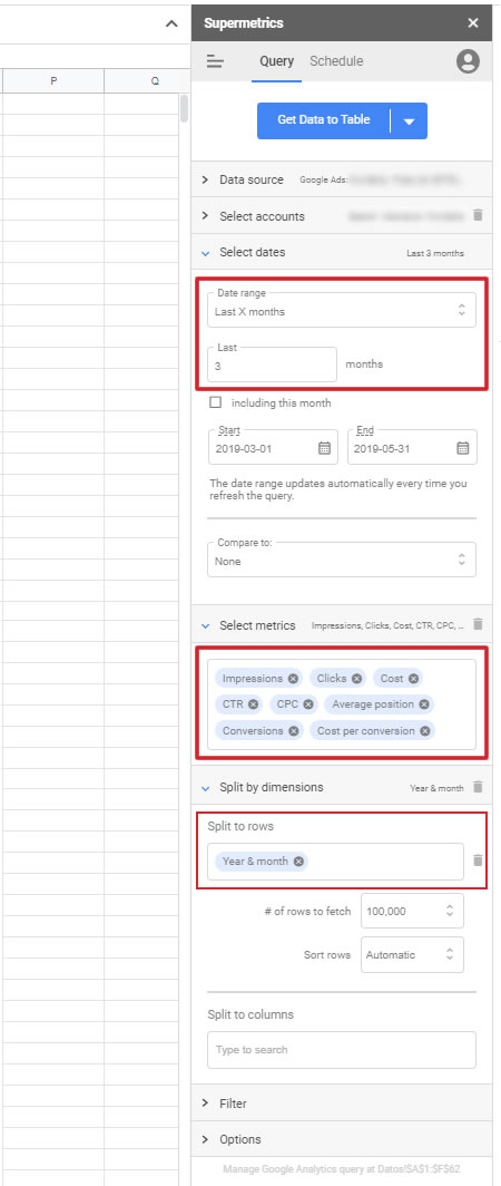 Vamos a ver los diferentes desplegables del sidebar de Supermetrics uno a uno (no olvides echar un ojo al pantallazo de debajo):
