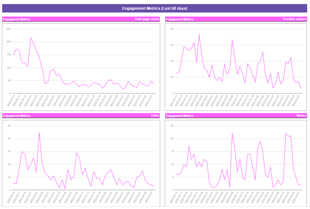 Colocar tus métricas de engagement en Facebook en un panel de control te ayudará a ver de un vistazo qué publicaciones generan la mayor engagement de tu audiencia y qué contenido o mensaje necesita ser perfeccionado.