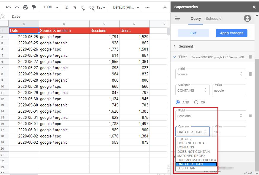 Para realizar filtros sobre métricas con Supermetrics aplicaremos mayoritariamente los dos últimos operadores, Mayor que y Menor que.