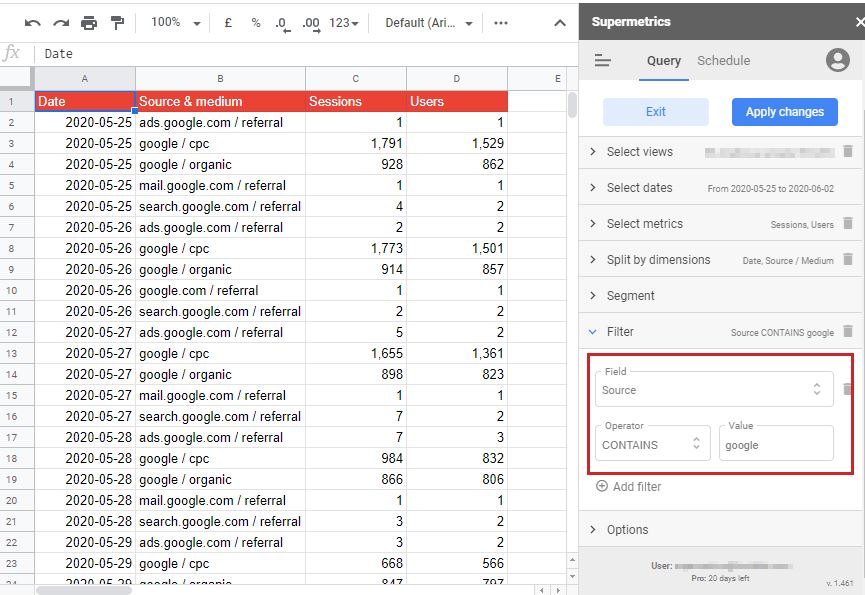 Ejemplos de filtros sobre Google Analytics con Supermetrics